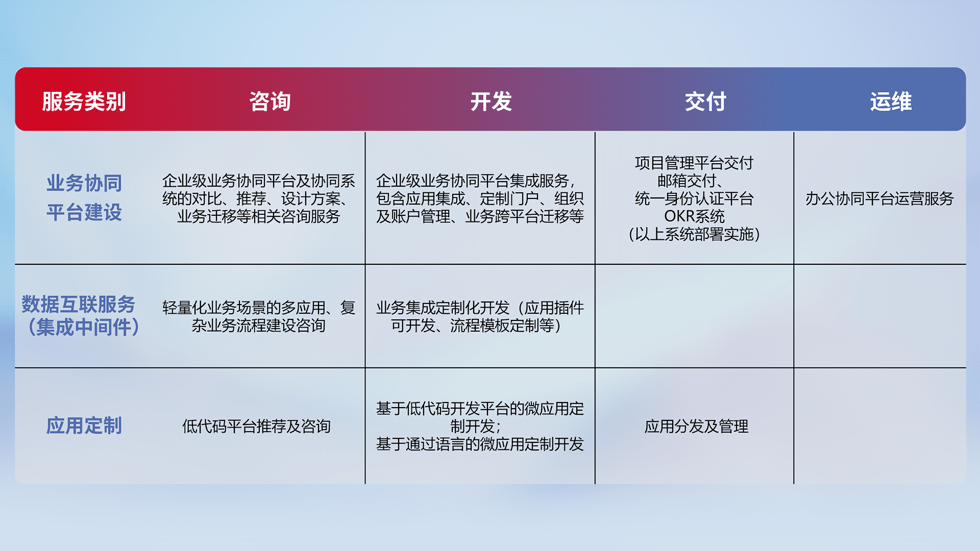 针对钉钉、、企微、、、、IDaas等平台级产品提供产品的规划、、方案、、交付、、、定制化开发等服务,,,实现如统一协同办公、、智能客户服务、、、、混合会议管理、、、、智能数据查询、、、等业务场景,,,实现数字化转型。。。