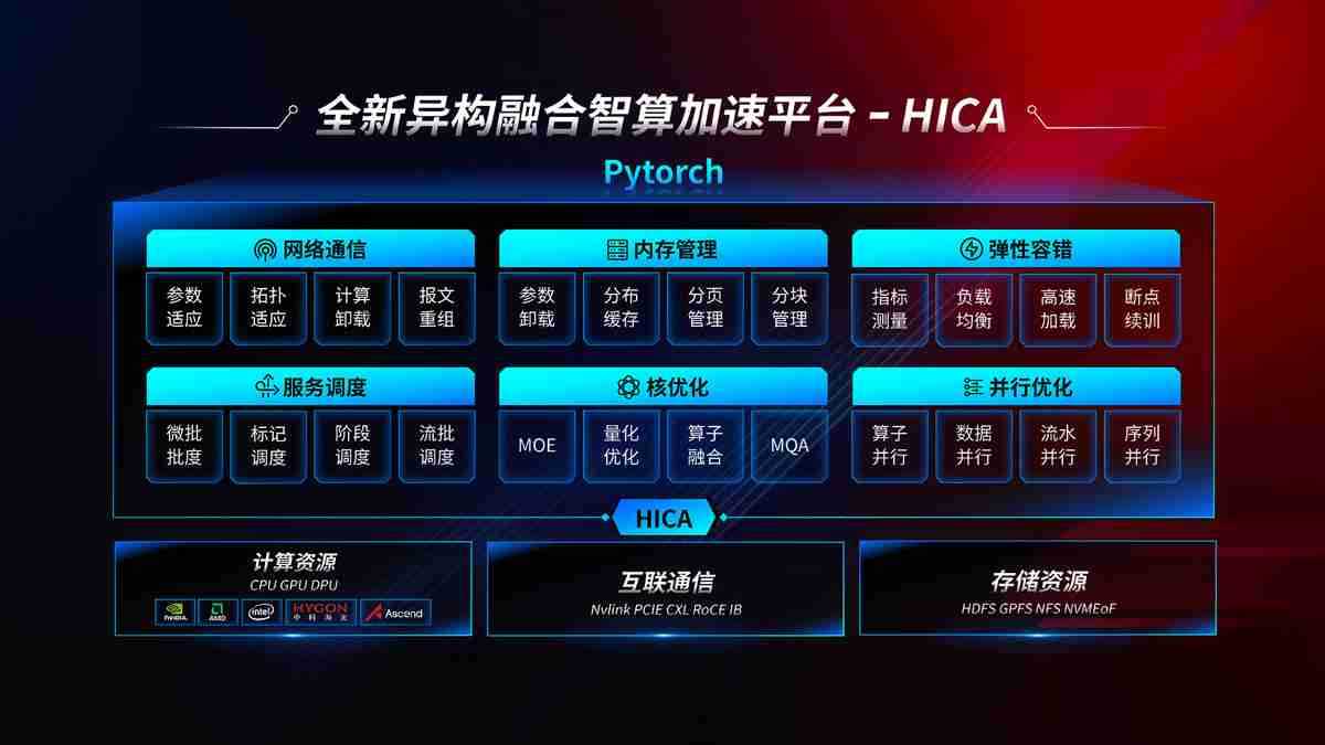 通过自研的服务层、、、、中间适配层、、、以及调度编排算法,,采用数据并行、、、、模型并行等多种并行方式,,,,把并行计算任务进行有效的分解,,,,使其分别由相应的软件栈和算力资源来承接。。。。当GPU资源变化,,HICA可以实时动态调度计算子任务并调整模型拓扑和架构,,,以充分聚合各种算力资源。。。