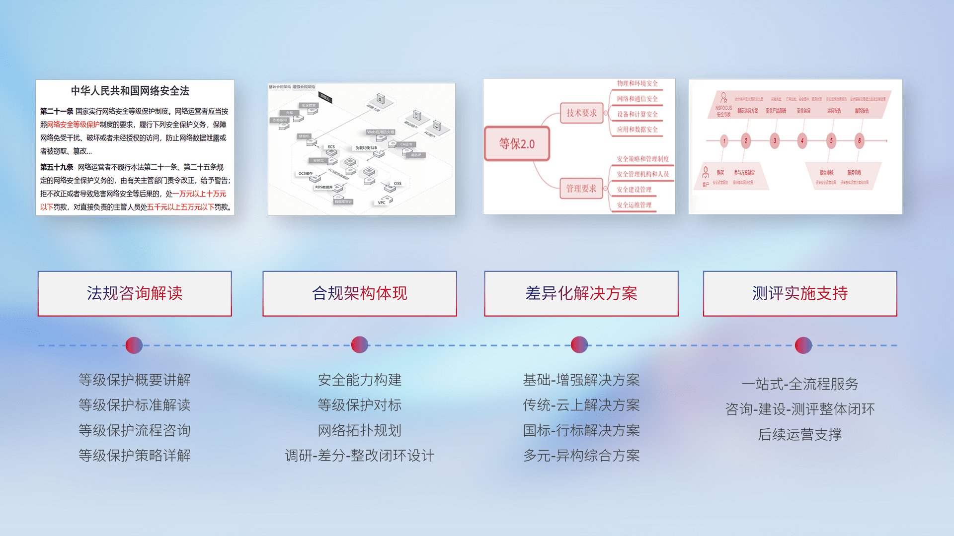 通过专业的法律咨询解读、、合规架构体现、、、差异化解决方案、、、测试实施支持等服务,,,为客户量身打造等保合规体系。。。